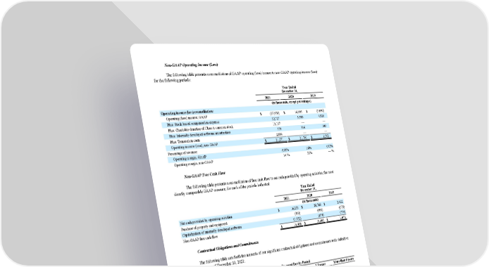 Non-GAAP Operating Income (Loss) The following table presents a reconciliation of GAAP operating (loss) income to non-GAAP operating income (loss) for the following periods : Year Ended December 31, 2021 2020 2019 (in thousands, except percentages) Operating income (loss) reconciliation: Operating (loss) income, GAAP $ (27,976) $ 16,095 $ (5,090) Plus: Stock-based compensation expense 32,727 5,380 4,826 Plus: Charitable donation of Class A common stock 13,107 — — Plus: Internally developed software amortization 579 316 108 Plus: Transaction costs 2,834 — — Operating income (loss), non-GAAP $ 21,271 $ 21,791 $ (156) Percentage of revenue: Operating margin, GAAP (19) % 16 % (10) % Operating margin, non-GAAP 14 % 22 % — % Non-GAAP Free Cash Flow The following table presents a reconciliation of free cash flow to net cash provided by operating activities, the most directly comparable GAAP measure, for each of the periods indicat e d . Year Ended December 31, 2021 2020 2019 (in thousands) Net cash provided by operating activities $ 16,253 $ 20,768 $ 2,422 Purchase of property and equipment (393) (399) (573) Capitalization of internally developed software (1,452) (874) (779) Non-GAAP free cash flow $ 14,408 $ 19,495 $ 1,070 Contractual Obligations and Commitments The following table sets forth the amounts of our significant contractual obligations and commitments with definitive payment terms as of December 31, 2021 : Payment Due by Period Total Less than 1 year 1-3 years 3-5 years More than 5 years (in thousands) Operating lease obligations $ 25,649 $ 3,559 $ 6,132 $ 5,845 $ 10,113 Unconditional purchase obligations (1) 15,000 5,000 10,000 — — Total $ 40,649 $ 8,559 $ 16,132 $ 5,845 $ 10,113 (1) Unconditional purchase obligation relates to cloud-based services to support our infrastructure. The commitment amounts in the table above are associated with contracts that are enforceable and legally binding and that specify all significant terms, including fixed or minimum services to be used, fixed, minimum or variable price provisions, and the approximate timing of the actions under the contracts. The table does not include obligations under agreements that we can cancel without a significant penalty. See “Note 14 — Commitments and Contingencies” of the Notes to Consolidated Financial Statements included in Part II, Item 8 of this Annual Report on Form 10-K for additional information regarding contractual obligations and commitments. 65