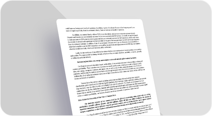 could harm our business and results of operations. In addition, reports of foodborne illnesses or food tampering could, as a result of negative publicity about the restaurant industry, harm our business and results of operations. In addition, we contract directly with our DSPs to provide delivery services to our restaurant customers through Dispatch and then invoice our restaurant customers for the cost associated with DSP services. As a result, we may be required to make payments to DSPs prior to receiving payment from our restaurant customers for DSP transactions, which could reduce the amount of cash and cash equivalents we have available for the period between payment to the DSPs and receipt of payment from the restaurant customer. In addition, if any of our restaurant customers were to go out of business, become insolvent, or otherwise be unable to pay for DSP transactions, we would be responsible for making payments to the DSPs that our customers otherwise would have made, which could adversely affect our business. Lastly, the increased pace of consolidation in certain industries may result in reduced overall spending on our platform and modules. We cannot predict the timing, strength, or duration of any economic slowdown, instability, or recovery, generally or within any particular industry. Increases in food, labor, rent, energy, and occupancy costs could adversely affect results of operations. Our financial success is dependent, in part, on the ability of our restaurant customers to increase digital ordering and maintain profitability. These customers may experience increased operating costs, including as a result of changes to food, labor, rent, energy, occupancy, insurance, and supply costs, as well as costs of safety equipment related to the COVID-19 pandemic, and they may be unable to recover these costs through increased menu prices, and as a result, may cease operations. Additionally, if our restaurant customers raise prices in light of these factors, order volume may decline, which could harm our revenue and results of operations. Various factors beyond our control, including government regulations relating to independent contractor classifications, price controls on food delivery logistics platforms, labor shortages, supply constraints, inflation, and minimum wage increases, may also affect the total cost of digital food orders to consumers. The overall cost environment for food commodities can also be volatile due to domestic and worldwide agricultural supply and demand and other macroeconomic factors that are outside of our control. If our current or future customers and partners are unable to maintain or increase digital orders or maintain profitability, our business, financial condition, and results of operations could be harmed. Risks Related to Ownership of Our Class A Common Stock The dual-class structure of our common stock has the effect of concentrating voting control with our existing stockholders, executive officers, directors, and their affiliates, which will limit your ability to influence the outcome of important transactions and to influence corporate governance matters, such as electing directors, and to approve material mergers, acquisitions, or other business combination transactions that may not be aligned with your interests. Our Class B common stock has ten votes per share, whereas our Class A common stock has one vote per share. As of December 31, 2021, holders of our Class B common stock collectively owned shares representing approximately 92% of the voting power of our outstanding capital stock. As of December 31, 2021, our directors and executive officers and their affiliates collectively beneficially owned, in the aggregate, shares representing approximately 82% of the voting power of our outstanding capital stock. As a result, the holders of our Class B common stock are able to exercise considerable influence over matters requiring stockholder approval, including the election of directors and approval of significant corporate transactions, such as a merger or other sale of our company or our assets, even if their stock holdings represent less than a majority of the outstanding shares of our capital stock. This concentration of ownership limits the ability of other stockholders to influence corporate matters and may cause us to make strategic decisions that could involve risks to you or that may not be aligned with your interests. This control may adversely affect the market price of our Class A common stock. Further, future transfers by holders of our Class B common stock will generally result in those shares converting into shares of our Class A common stock, subject to limited exceptions, such as certain transfers effected for tax or estate planning purposes. The conversion of shares of our Class B common stock into shares of our Class A common stock will have the effect, over time, of increasing the relative voting power of those holders of Class B common stock who retain their shares in the long- term. In addition, while we do not expect to issue any additional shares of Class B common stock, any future issuances of Class B common stock would be dilutive to holders of Class A common stock. Such issuances would also reduce the voting 39