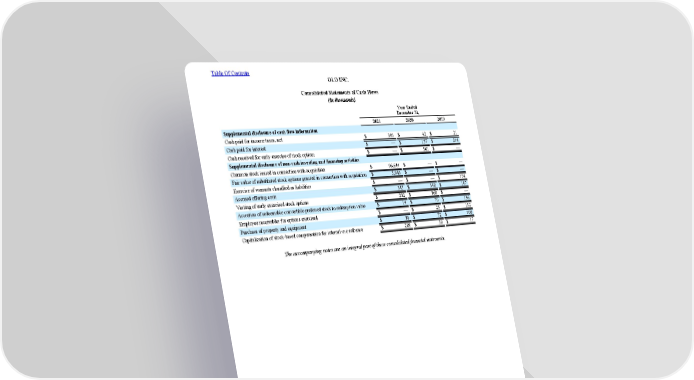 Year Ended December 31, 2021 2020 2019 Supplemental disclosure of cash flow information Cash paid for income taxes, net $ 393 $ 42 $ 21 Cash paid for interest $ — $ 157 $ 214 Cash received for early exercise of stock options $ — $ 561 $ — Supplemental disclosure of non-cash investing and financing activities Common stock issued in connection with acquisition $ 96,644 $ — $ — Fair value of substituted stock options granted in connection with acquisition $ 5,943 $ — $ — Exercise of warrants classified as liabilities $ — $ — $ 154 Accrued offering costs $ 345 $ 348 $ 147 Vesting of early exercised stock options $ 232 $ 368 $ — Accretion of redeemable convertible preferred stock to redemption value $ 14 $ 70 $ 136 Employee receivables for options exercised $ — $ 23 $ 132 Purchase of property and equipment $ 30 $ 72 $ 100 Capitalization of stock-based compensation for internal-use software $ 288 $ 38 $ 17 The accompanying notes are an integral part of these consolidated financial statements. Table Of Contents OLO INC. Con solidated Statements of Cash Flows (in thousands) 76