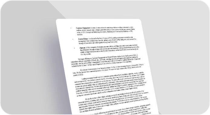• Customer Engagement . A suite of restaurant-centric marketing solutions enabling restaurants to collect, analyze, and act on guest data to deepen guest relationships, boost revenue, and increase customer lifetime value, or CLV, through our Marketing Automation, Sentiment, and Customer Data Platform, or CDP, modules. • Front-of-House . A solution for the front of house, or FOH, enabling restaurants to streamline order management from multiple sales channels, optimize seat utilization in the dining room, and increase flow- through of reservation and waitlist parties through our Host module. • Payment . A fully-integrated, frictionless payment platform, enabling restaurants to grow and protect their digital business through an improved customer payment experience, offering advanced fraud prevention that results in improved authorization rates for valid transactions, and increased basket conversion through our Olo Pay module. We began offering our Customer Engagement and Front-of-House s olutions in the fourth quarter of 2021, in connection with our acquisition of Wisely, Inc., or Wisely, a leading customer intelligence and engagement platform for restaurants. See the section titled “Management’s Discussion and Analysis of Financial Condition and Results of Operations” included in Part II, Item 7 of this Annual Report on Form 10-K for a further discussion of this acquisition. We released a beta version of our Payment solution , Olo Pay, to select restaurants brands in October 2020. While in beta, Olo Pay has not been a material generator of revenues. We expect to begin commercially offering Olo Pay in the first quarter of 2022. Leading restaurant brands trust Olo’s enterprise-grade platform for its capabilities, reliability, security, scalability, and interoperability. Our platform currently handles, on average, more than 2 million orders per day, and m ore than 85 million consumers have transacted on our platform over the last year. We continually invest in architectural improvements so that our system can scale in tandem with our continued growth. Additionally, both internal and external security experts frequently test our system for vulnerabilities. We have never experienced a material breach of customer or consumer data. Our open SaaS platform integrates with over 200 restaurant technology solutions including POS systems, aggregators, DSPs, Ordering Service Providers, or OSPs, payment processors, user experience, or UX, and user interface, or UI, providers, and loyalty programs, giving our customers significant control over the configuration and features of their distinct digital offering. We are the exclusive direct digital ordering provider for our leading brands across all service models of the restaurant industry, including quick service, fast casual, casual dining, family dining, and coffee and snack food. Our customers include major publicly traded and the fastest growing private restaurant brands. As of December 31, 2021, we had approximately 500 brand customers, representing approximately 79,000 active locations, using our platform. Our contracts typically have initial terms of three years or longer, with continuous one-year automatic renewal periods, providing visibility into our future financial performance. We have a highly efficient go-to-market model as a result of our industry thought leadership, partnership approach with our restaurant customers, and experienced enterprise sales, customer success, and deployment teams. Unlike other enterprise software businesses, where the sales team works to add a single location or division and expand to others, we enter into relationships at the brand’s corporate level and strive to secure exclusivity across all company-owned and franchise locations. This enables us to deploy our modules across all new and existing brand locations without any additional sales and marketing costs, and upsell new offerings to the brand itself, rather than each individual location. We refer to our business model as a transactional SaaS model, as it includes both subscription and transaction- based revenue streams, and we designed it to align with our customers’ success. Our model allows our customers to forego the cost of building, maintaining, and securing their own digital ordering and delivery platforms and to retain direct relationships with their consumers while maximizing profitability. Our hybrid-pricing model provides us with a predictable revenue stream and enables us to further grow our revenue as our customers increase their digital order volume. We generate subscription revenue from our Ordering, Switchboard, Kiosk, Virtual Brands, Marketing Automation, Sentiment, CDP, and Host modules . In addition, a growing portion of our customers purchase an allotment of monthly orders for a fixed monthly fee and pay us an additional fee for each excess order, which we also consider to be subscription revenue. Our transaction revenue includes revenue generated from our Rails , Dispatch, Virtual Brand s , and Olo Pay modules. In most cases, we also charge aggregators, channel partners, and other service providers in our ecosystem on a per transaction basis for access to our Rails and Dispatch modules. We also derive transactional revenue from other products, including Network, which allows brands to take orders from non-marketplace digital channels (e.g., Google Food Ordering, which enables restaurants to fulfill orders directly through Google search results and Maps pages). These products generate fees predominantly through revenue sharing agreements with partners. For the years ended December 31, 2021 , 2020 , and 2019 , 46.4% , 48.2% , and 72.4% of our platform revenue was subscription revenue, respectively, and 53.6% , 51.8% , and 27.6% was transaction revenue, respectively. 2