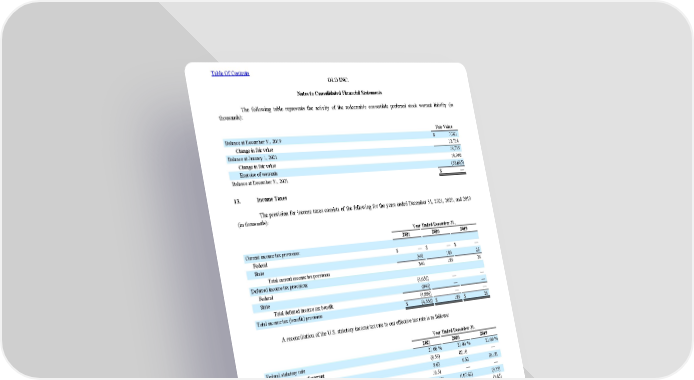 The fol lowing table represents the activity of the redeemable convertible preferred stock warrant liability (in thousands): Fair Value Balance at December 31, 2019 $ 7,021 Change in fair value 12,714 Balance at January 1, 2021 19,735 Change in fair value 18,930 Exercise of warrants (38,665) Balance at December 31, 2021 $ — 13. Income Taxes The provision for income taxes consists of the following for the years ended December 31, 2021 , 2020 , and 2019 (in thousands): Year Ended December 31, 2021 2020 2019 Current income tax provision: Federal $ — $ — $ — State 340 189 26 Total current income tax provision 340 189 26 Deferred income tax provision: Federal (4,056) — — State (840) — — Total deferred income tax benefit (4,896) — — Total income tax (benefit) provision $ (4,556) $ 189 $ 26 A reconciliation of the U.S. statutory income tax rate to our effective tax rate is as follows: Year Ended December 31, 2021 2020 2019 Federal statutory rate 21.00 % 21.00 % 21.00 % Change in fair value of warrant (8.53) 82.10 — State and local taxes, net of federal benefit 8.63 6.32 (0.18) Acquisition-related deferred tax liability 10.51 — — Valuation allowance (90.05) (107.62) (9.35) Stock-based compensation 86.84 4.50 (3.65) Executive compensation (16.81) — — Other (1.86) (0.47) (8.14) Total provision and effective tax rate 9.73 % 5.83 % (0.32) % The difference between income taxes at the U.S. federal statutory income tax rate of 21% and the amounts reported primarily relates to stock-based compensation, offset by the valuation allowance and the reduction of the valuation allowance due to excess deferred tax liability resulting from the Wisely acquisition. Table Of Contents OLO INC. Notes to Consolidated Financial Statements 99