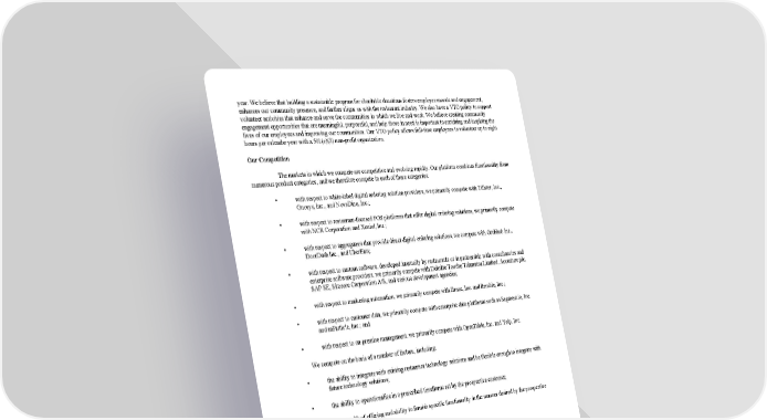 year. We believe that building a sustainable program for charitable donations fosters employee morale and engagement, enhances our community presence, and further aligns us with the restaurant industry. We also have a VTO policy to support volunteer activities that enhance and serve the communities in which we live and work. We believe creating community engagement opportunities that are meaningful, purposeful, and help those in need is important to enriching and inspiring the lives of our employees and improving our communities. Our VTO policy allows full-time employees to volunteer up to eight hours per calendar year with a 501(c)(3) non-profit organization. Our Competition The markets in which we compete are competitive and evolving rapidly. Our platform combines functionality from numerous product categories, and we therefore compete in each of these categories: • with respect to white-label digital ordering solution providers, we primarily compete with Tillster, Inc., Onosys, Inc., and NovaDine, Inc.; • with respect to restaurant-focused POS platforms that offer digital ordering solutions, we primarily compete with NCR Corporation and Xenial, Inc.; • with respect to aggregators that provide direct digital ordering solutions, we compete with Grubhub Inc., DoorDash Inc., and UberEats; • with respect to custom software, developed internally by restaurants or in partnership with consultancies and enterprise software providers, we primarily compete with Deloitte Touche Tohmatsu Limited, Accenture plc, SAP SE, Sitecore Corporation A/S, and various development agencies; • with respect to marketing automation, we primarily compete with Braze, Inc. and Iterable, Inc.; • with respect to customer data, we primarily compete with enterprise data platforms such as Segment.io, Inc. and mParticle, Inc.; and • with respect to on-premise management, we primarily compete with OpenTable, Inc. and Yelp, Inc. We compete on the basis of a number of factors, including: • the ability to integrate with existing restaurant technology solutions and be flexible enough to integrate with future technology solutions; • the ability to operationalize in a prescribed timeframe set by the prospective customer; • the breadth of offering and ability to furnish specific functionality in the manner desired by the prospective customer; • solution performance, security, scalability, and reliability; • the ability to operationally implement with a customer’s infrastructure; • the ability to operate and support all geographic markets specified by the prospective customer; • the availability and quality of support and other professional services; • the ability to integrate our systems seamlessly and at low costs; and • brand recognition, reputation, and the satisfaction of customers. We believe that we compete favorably with respect to the factors listed above. However, many of our competitors have greater financial, technical, and other resources, greater brand recognition, larger sales forces and marketing budgets, broader distribution networks, more diverse product and services offerings, and larger and more mature intellectual property portfolios. They may be able to leverage these resources to gain business in a manner that discourages customers from purchasing our offerings. Furthermore, we expect that our industry will continue to attract new market entrants, including 13