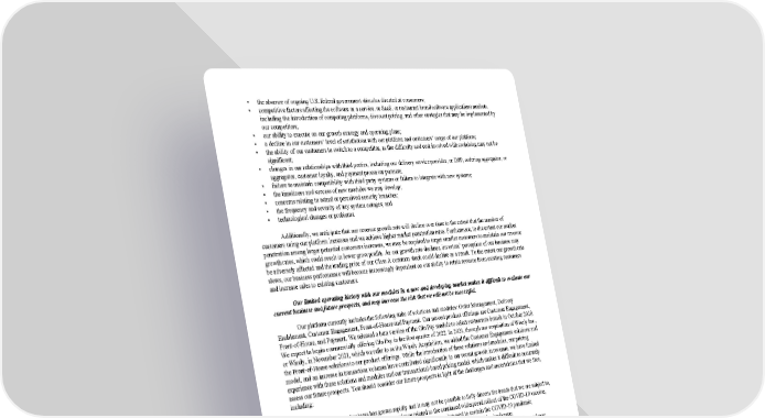 • the absence of ongoing U.S. federal government stimulus directed at consumers; • competitive factors affecting the software as a service, or SaaS, or restaurant brand software applications markets, including the introduction of competing platforms, discount pricing, and other strategies that may be implemented by our competitors; • our ability to execute on our growth strategy and operating plans; • a decline in our customers’ level of satisfaction with our platform and customers’ usage of our platform; • the ability of our customers to switch to a competitor, as the difficulty and cost involved with switching may not be significant; • changes in our relationships with third parties, including our delivery service provider, or DSP, ordering aggregator, or aggregator, customer loyalty, and payment processor partners; • failure to maintain compatibility with third party systems or failure to integrate with new systems; • the timeliness and success of new modules we may develop; • concerns relating to actual or perceived security breaches; • the frequency and severity of any system outages; and • technological changes or problems. Additionally , we anticipate that our revenue growth rate will decline over time to the extent that the number of customers using our platform increases and we achieve higher market penetration rates. Furthermore, to the extent our market penetration among larger potential customers increases, we may be required to target smaller customers to maintain our revenue growth rates, which could result in lower gross profits. As our growth rate declines, investors’ perception of our business may be adversely affected and the trading price of our Class A common stock could decline as a result. To the extent our growth rate slows, our business performance will become increasingly dependent on our ability to retain revenue from existing customers and increase sales to existing customers. Our limited operating history with our modules in a new and developing market makes it difficult to evaluate our current business and future prospects, and may increase the risk that we will not be successful. Our platform currently includes the following suite of solutions and modules: Order Management, Delivery Enablement, Customer Engagement, Front-of-House and Payment. Our newest product offerings are Customer Engagement, Front-of-House, and Payment. We released a beta version of the Olo Pay module to select restaurants brands in October 2020. We expect to begin commercially offering Olo Pay in the first quarter of 2022. In 2021, through our acquisition of Wisely Inc., or Wisely, in November 2021, which we refer to as the Wisely Acquisition, we added the Customer Engagement solutions and the Front-of-House solutions to our product offerings. While the introduction of these solutions and modules, our pricing model, and an increase in transaction volumes have contributed significantly to our recent growth in revenue, we have limited experience with these solutions and modules and our transactional-based pricing model, which makes it difficult to accurately assess our future prospects. You should consider our future prospects in light of the challenges and uncertainties that we face, including: • the fact that our business has grown rapidly and it may not be possible to fully discern the trends that we are subject to, including negative trends we may experience related to the continued widespread rollout of the COVID-19 vaccine, reopening of indoor dining, and other actions and restrictions imposed to contain the COVID-19 pandemic; • that we operate in a new and developing market with a rapidly changing competitive landscape; • that we may be unable to accurately predict our revenue and operating expenses for new modules that we release; • our ability to enhance or retain our brand among customers and potential customers; • that we may in the future enter into additional new and developing markets that may not develop as we expect or that our platform or modules may not adequately address; and • that elements of our business strategy are new and subject to ongoing development. We have encountered and will continue to encounter risks and difficulties frequently experienced by growing companies in rapidly changing industries, including increasing and unforeseen expenses as we continue to grow our business. If our assumptions regarding these risks and uncertainties, which we use to plan and operate our business, are incorrect or change, or if we do not manage these risks successfully, our reputation, business, results of operations, and prospects will be harmed. Our business could be harmed if we fail to manage our growth effectively. The rapid growth we have experienced in our business places significant demands on our operational infrastructure. The scalability and flexibility of our platform depends on the functionality of our technology and cloud infrastructure and its ability to handle increased traffic and demand. The growth in the number of third-party ecosystem partners, customers using our 17