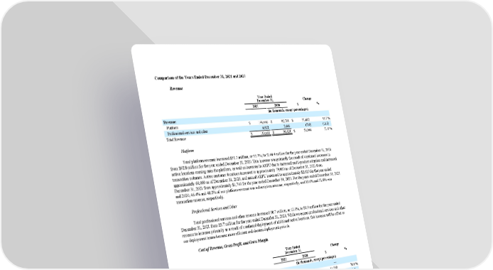 Comparison of the Years Ended December 31, 2021 and 2020 Revenue Year Ended December 31, Change 2021 2020 $ % (in thousands, except percentages) Revenue: Platform $ 144,446 $ 92,764 $ 51,682 55.7 % Professional services and other 4,922 5,660 (738) (13.0) Total Revenue $ 149,368 $ 98,424 $ 50,944 51.8 % Platform Total platform revenue increased $51.7 million , or 55.7% , to $144.4 million for the year ended December 31, 2021 from $92.8 million for the year ended December 31, 2020 . This increase was primarily the result of continued increases in active locations coming onto the platform, as well as increases in ARPU due to increased multi-product adoption and increased transaction volumes. Active customer locations increased to approximately 79,000 as of December 31, 2021 from approximately 64,000 as of December 31, 2020, and annual ARPU increased to approximately $2,019 for the year ended December 31, 2021 from approximately $1,740 for the year ended December 31, 2020 . For the years ended December 31, 2021 and 2020 , 46.4% and 48.2% of our platform revenue was subscription revenue, respectively, and 53.6% and 51.8% was transaction revenue, respectively. Professional Services and Other Total professional services and other revenue decreased $0.7 million , or 13.0% , to $4.9 million for the year ended December 31, 2021 from $5.7 million for the year ended December 31, 2020 . While we expect professional services and other revenue to increase primarily as a result of continued deployment of additional active locations, this increase will be offset as our deployment teams become more efficient and shorten deployment periods. Cost of Revenue, Gross Profit, and Gross Margin Year Ended December 31, Change 2021 2020 $ % (in thousands, except percentages) Cost of revenue: — Platform $ 25,572 $ 14,334 $ 11,238 78.4 % Professional services and other 5,258 4,334 924 21.3 Total cost of revenue $ 30,830 $ 18,668 $ 12,162 65.1 % Percentage of revenue: Platform 17.1 % 14.6 % Professional services and other 3.5 4.4 Total cost of revenue 20.6 % 19.0 % Gross Profit $ 118,538 $ 79,756 $ 38,782 48.6 % Gross Margin 79.4 % 81.0 % Platform Total platform cost of revenue increased $11.2 million , or 78.4% , to $25.6 million for the year ended December 31, 2021 from $14.3 million for the year ended December 31, 2020 . This increase was primarily the result of higher hosting costs 58