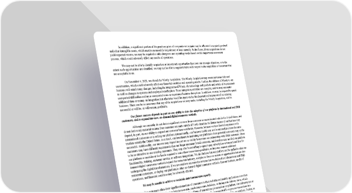 In addition, a significant portion of the purchase price of companies we acquire may be allocated to acquired goodwill and other intangible assets, which must be assessed for impairment at least annually. In the future, if our acquisitions do not yield expected returns, we may be required to take charges to our operating results based on this impairment assessment process, which could adversely affect our results of operations. We may not be able to identify acquisition or investment opportunities that meet our strategic objectives, or to the extent such opportunities are identified, we may not be able to negotiate terms with respect to the acquisition or investment that are acceptable to us. On November 4, 2021, we closed the Wisely Acquisition. The Wisely Acquisition may create numerous risks and uncertainties, which could adversely affect our financial condition and operating results. Further, the addition of Wisely to our business will entail many changes, including the integration of Wisely, its technology and products and certain of its personnel as well as changes in systems and employee benefit plans. These integration activities are complex, and we may encounter unexpected difficulties and incur unexpected costs or experience business disruptions. In addition, we may be required to spend additional time or money on integration that otherwise would be spent on the development and expansion of our existing business. There can be no assurance that any of the acquisitions we may make, including the Wisely Acquisition, will be successful or will be, or will remain, profitable. Our future success depends in part on our ability to drive the adoption of our platform by international and SMB customers, and to expand into new, on-demand digital commerce verticals. Although we currently do not derive significant revenue from customer accounts located outside the United States, and do not derive any material revenue from customer accounts outside of North America, the future success of our business may depend, in part, on our ability to expand our customer base worldwide. However, because we have limited experience with international customers or in selling our platform internationally, our business model may not be successful or have the same traction outside the United States. As a result, our investment in marketing our platform to these potential customers may not be successful. Additionally, our success may depend in part on our ability to increase our partnerships with SMB customers. These customers may have different requirements than our larger restaurant brand customers, and therefore may not find our platform to be as attractive as our existing customers. They may also be unwilling to agree to pay subscription or transactional fees for our platform or modules at the levels required to make these transactions profitable, or they may request additional functionality, training, customer service, or software integrations. We also believe that our platform can be applied to other on- demand digital commerce verticals beyond the restaurant industry, and plan to focus on sectors or opportunities that are also undergoing the digital transformations. If we are unable to increase the revenue that we derive from international and SMB restaurant customers, or deploy our platform in other on-demand digital commerce verticals, then our business, results of operations, and financial condition may be adversely affected. We may be unable to achieve or maintain data transmission capacity. Our customers often draw significant numbers of consumers to their websites and mobile applications over short periods of time, including during key television events, marketing events, holidays, or during peak delivery times, which significantly increases the traffic on our servers and the volume of transactions processed on our platform. Our infrastructure or software may be unable to achieve or maintain capacity high enough to handle increased traffic or process transactions in a timely manner. Our failure to achieve or maintain high capacity could significantly reduce demand for our platform. Further, as we continue to attract larger restaurant customers, the volume of data stored and transactions processed on our platform will increase, especially if such customers draw significant numbers of consumers over short periods of time. In the future, we may be required to allocate resources, including spending substantial amounts of money, to build, purchase, or lease additional infrastructure in order to handle the increased load. Our ability to deliver our platform also depends on the development and maintenance of internet and mobile application infrastructure by third parties, including by our cloud service provider. Such development and maintenance includes the maintenance of reliable networks with the necessary speed, data capacity, and bandwidth. If one of these third parties suffers from capacity constraints, our business may be adversely affected. Our business and prospects would be harmed if changes to technologies used in our platform or new versions or upgrades of operating systems or applications adversely impact the process by which customers and consumers interface with our platform. We believe that our platform’s functionality, simplicity, positive user experience, and ability to integrate with multiple technology partners in the restaurant ecosystem have helped us to expand and offer our platform to customers who may have limited technical personnel. In the future, providers of mobile, website, or other operating systems or applications could introduce new features, policies, or rules that would make it difficult for customers to use our platform. In addition, mobile 19