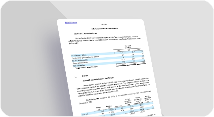 Stock-Based Compensation Expense The classification of stock-based compensation expense , which includes expense for stock options, RSUs, SARs, and ESPP charges, by line item within the consolidated statements of operations and comprehensive (l oss ) income is as follows (in thousands): Year Ended December 31, 2021 2020 2019 Cost of revenue - platform $ 2,705 $ 556 $ 253 Cost of revenue - professional services and other 474 124 46 Research and development 11,283 1,497 814 General and administrative 16,137 2,827 3,493 Sales and marketing 2,128 376 220 Total stock-based compensation expense $ 32,727 $ 5,380 $ 4,826 12. Warrants Redeemable Convertible Preferred Stock Warrants Prior to the IPO, warrants to purchase 1,682,847 shares of our outstanding redeemable convertible preferred stock were exercised and converted into redeemable convertible preferred stock. Upon completion of the IPO, all shares of our outstanding redeemable convertible preferred stock, inclusive of the shares issued pursuant to these warrant exercises, converted into 100,196,780 shares of Class B common stock. The redeemable convertible preferred stock warrant liability was reclassified to additional paid-in capital in connection with the IPO. The following table summarizes the activity of the redeemable convertible preferred stock warrants since December 31, 2020 : Issuance Date Expiration Date Exercise Price Warrants Outstanding at December 31, 2020 Warrants Exercised in The Year Ended December 31, 2021 Warrants Outstanding at December 31, 2021 Series A-1 2012 5/14/2022 $ 0.17 151,640 151,640 — Series C 2014 10/10/2024 0.70 562,241 562,241 — Series C 2016 1/12/2026 — 968,966 968,966 — Total 1,682,847 1,682,847 — The estimated fair value of the redeemable preferred stock underlying the warrants was approximately $12.77 per share as of December 31, 2020 . At December 31, 2020 , given the significant increase in fair value of each series of redeemable convertible preferred stock relative to the warrant’s exercise price, we estimated the preferred stock warrant liability using the intrinsic value of each warrant, as the warrants were significantly in-the-money and the Black-Scholes input had a de minimis impact on their value . For the year ended December 31, 2021 , we recorded a fair value adjustment of approximately $18.9 million using the intrinsic value of each warrant on the date of the conversion immediately prior to the IPO, as the warrants were significantly in-the- money a nd the Black-Scholes input have a de minimis impact on their value . Table Of Contents OLO INC. Notes to Consolidated Financial Statements 98