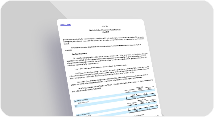 Table Of Contents OLO INC. Notes to the Condensed Consolidated Financial Statements (Unaudited) quantitative assessment and the fair value of the reporting unit is determined by analyzing the expected present value of future cash flows. If the carrying value of the reporting unit continues to exceed its fair value, the fair value of the reporting unit’s goodwill is calculated and an impairment loss equal to the excess is recorded. We assess the impairment of intangible assets whenever events or changes in circumstances indicate that the carrying amount may not be recoverable. Fair Value Measurement Fair value is the exchange price that would be received for an asset or paid to transfer a liability (an exit price) in the principal or most advantageous market for the asset or liability in an orderly transaction between market participants on the measurement date. We apply the following fair value hierarchy, which prioritizes the inputs used to measure fair value into three levels and bases the categorization within the hierarchy upon the lowest level of input that is available and significant to the fair value measurement: Level 1 inputs: Based on unadjusted quoted prices in active markets for identical assets or liabilities. Level 2 inputs: Based on observable inputs other than Level 1 prices such as quoted prices for similar assets or liabilities; quoted prices in markets with insufficient volume or infrequent transactions (less active markets); or model-derived valuations in which all significant inputs are observable or can be derived principally from or corroborated by observable market data for substantially the full term of the assets or liabilities. Level 3 inputs: Based on unobservable inputs to the valuation methodology that are significant to the measurement of fair value of assets or liabilities, and typically reflect management’s estimates of assumptions that market participants would use in pricing the asset or liability. The following summarizes assets and liabilities as of March 31, 2022 and December 31, 2021 that are measured at fair value on a recurring basis, by level, within the fair value hierarchy (in thousands): March 31, 2022 Level 1 Level 2 Level 3 Cash and cash equivalents: Money market funds $ 295,152 $ — $ — Total $ 295,152 $ — $ — December 31, 2021 Level 1 Level 2 Level 3 Cash and cash equivalents: Money market funds $ 295,101 $ — $ — Total $ 295,101 $ — $ — There were no transfers of financial instruments between Level 1, Level 2, and Level 3 during the periods presented. Our assets measured at fair value on a nonrecurring basis include long-lived assets and finite-lived intangibles, which are considered to be Level 3 inputs. During the three months ended March 31, 2021, we determined that the estimated fair value of a portion of our internal-use software was non- recoverable, and we recorded a non-cash impairment charge of $0.5 million, as more fully described in “Note 4—Property and Equipment.” Accounts receivable, accounts payable and accrued expenses are stated at their carrying value, which approximates fair value due to the short time to the expected receipt or payment date. 8