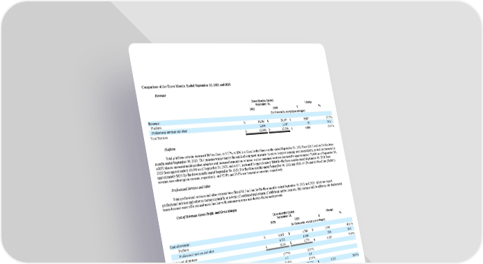 Comparison of the Three Months Ended September 30, 2021 and 2020 Revenue Three Months Ended September 30, Change 2021 2020 $ % (in thousands, except percentages) Revenue: Platform $ 36,084 $ 26,197 $ 9,887 37.7 % Professional services and other 1,306 1,307 (1) (0.1) Total Revenue $ 37,390 $ 27,504 $ 9,886 35.9 % Platform Total platform revenue increased $9.9 million, or 37.7%, to $36.1 million for the three months ended September 30, 2021 from $26.2 million for the three months ended September 30, 2020. This increase was primarily the result of continued increases in active locations coming onto the platform, as well as increases in ARPU due to increased multi-product adoption and increased transaction volumes. Active customer locations increased to approximately 76,000 as of September 30, 2021 from approximately 60,000 as of September 30, 2020, and ARPU increased to approximately $484 for the three months ended September 30, 2021 from approximately $450 for the three months ended September 30, 2020. For the three months ended September 30, 2021 and 2020, 47.2% and 44.9% of our platform revenue was subscription revenue, respectively, and 52.8% and 55.1% was transaction revenue, respectively. Professional Services and Other Total professional services and other revenue were flat at $1.3 million for the three months ended September 30, 2021 and 2020. While we expect professional services and other to increase primarily as a result of continued deployment of additional active locations, this increase will be offset as our deployment teams become more efficient and more familiar with customer systems and shorten deployment periods. Cost of Revenue, Gross Profit, and Gross Margin Three Months Ended September 30, Change 2021 2020 $ % (in thousands, except percentages) Cost of revenue: Platform $ 6,632 $ 3,583 $ 3,049 85.1 % Professional services and other 1,532 1,196 336 28.1 Total cost of revenue $ 8,164 $ 4,779 $ 3,385 70.8 % Percentage of revenue: Platform 17.7 % 13.0 % Professional services and other 4.1 4.3 Total cost of revenue 21.8 % 17.4 % Gross Profit $ 29,226 $ 22,725 $ 6,501 28.6 % Gross Margin 78.2 % 82.6 % Platform Total platform cost of revenue increased $3.0 million, or 85.1%, to $6.6 million for the three months ended September 30, 2021 from $3.6 million for the three months ended September 30, 2020. This increase was primarily the result of 33